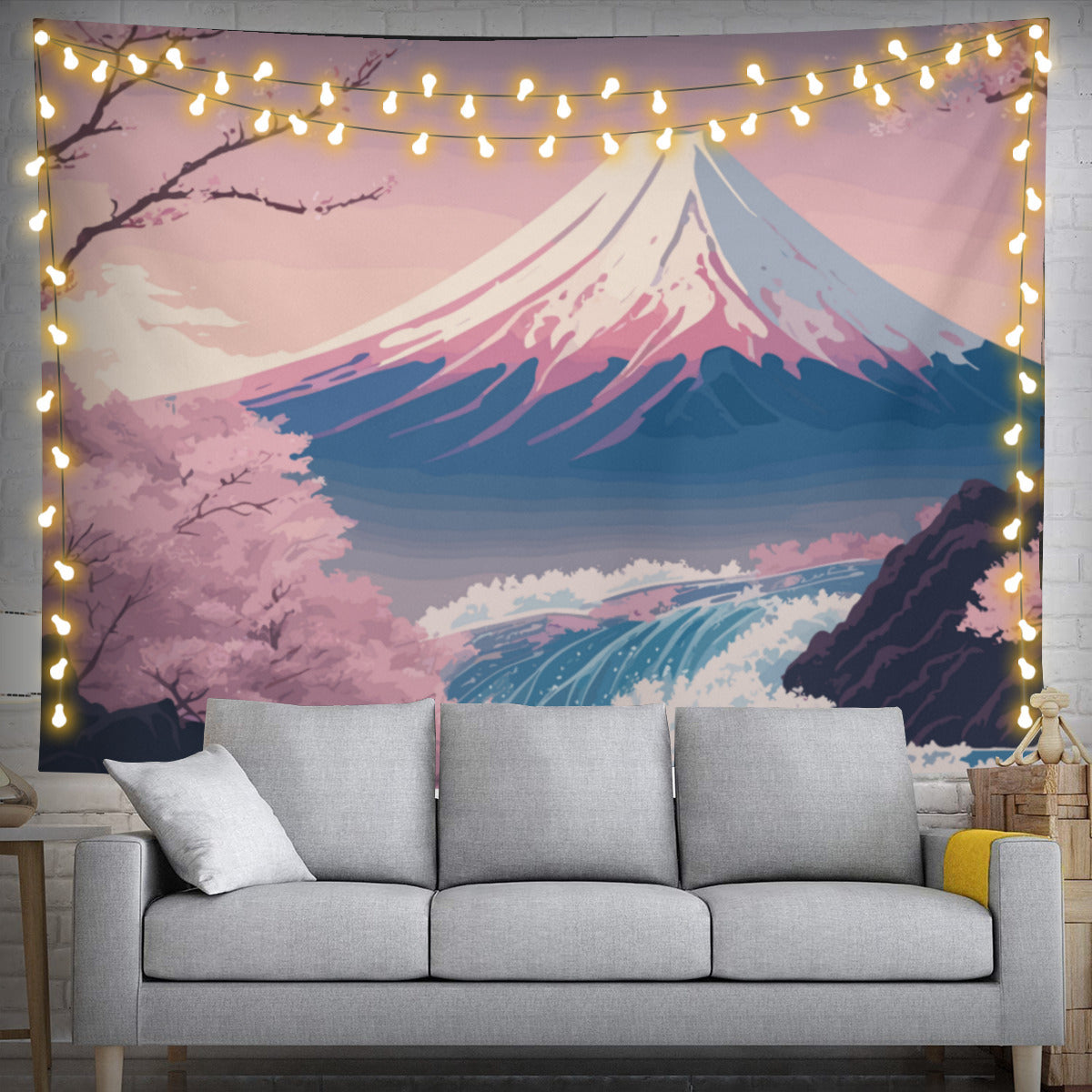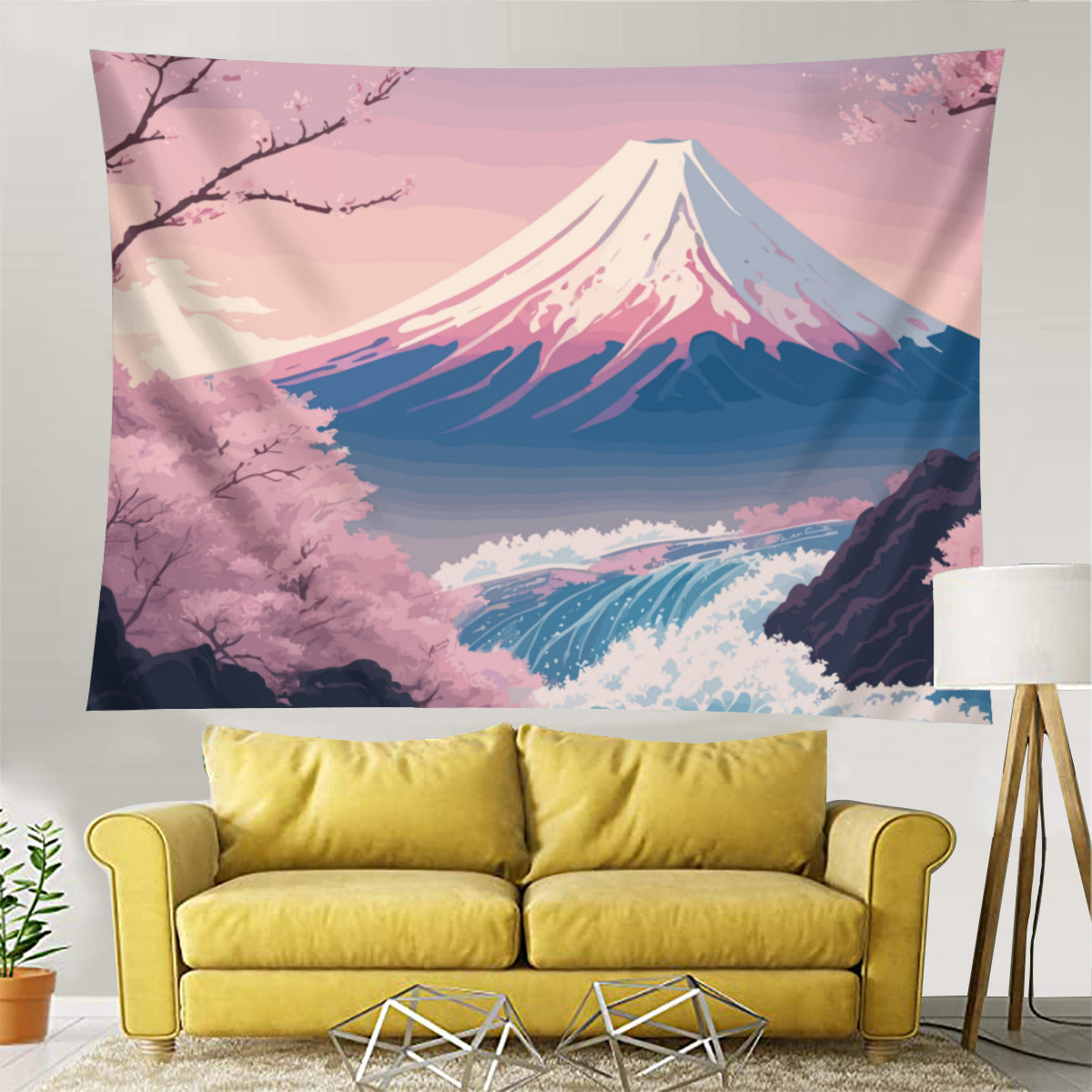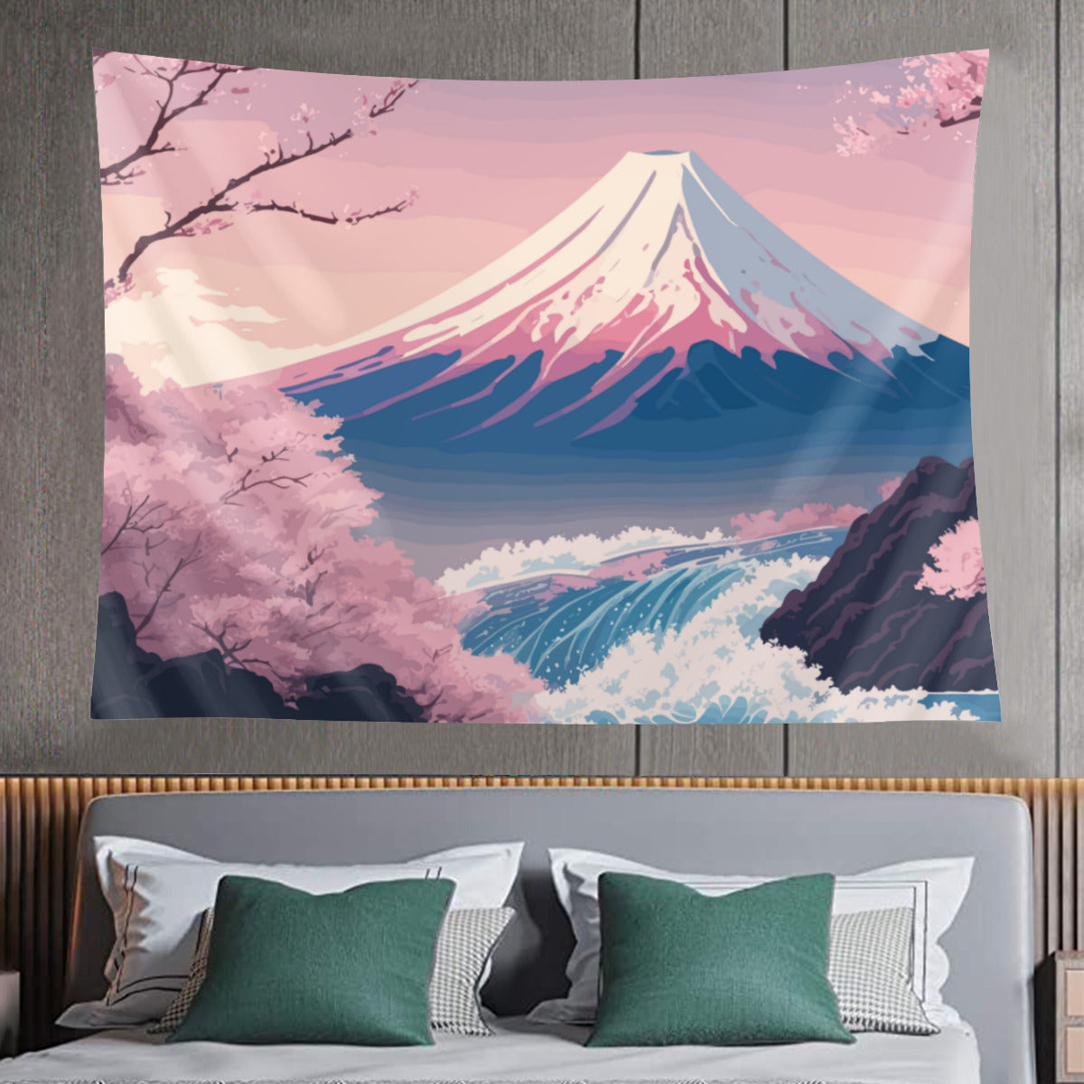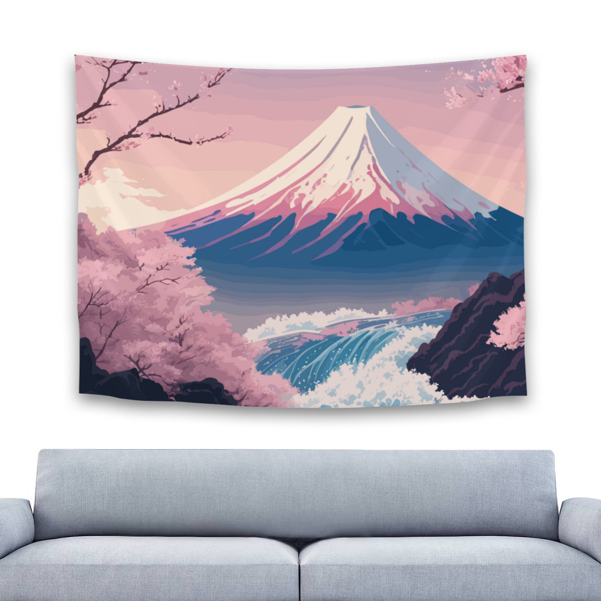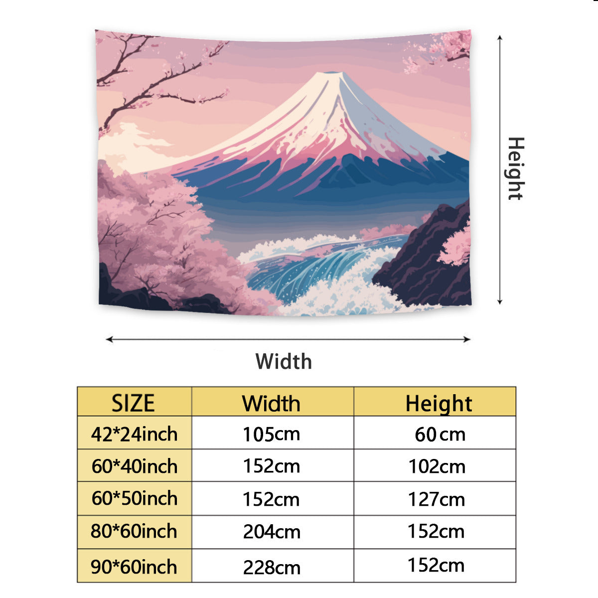 Introducing our stunning Japanese Mount Fuji Tapestry Wall Hanging! Immerse yourself in the tranquil charm of Japanese aesthetic art with this exquisite piece that effortlessly combines natural beauty and cultural elegance. The tapestry showcases a picturesque scene featuring the majestic Mount Fuji as the backdrop, beautifully complemented by delicate sakura cherry blossoms, a serene river, and a captivating Japanese landscape. The dainty pink and blue shades add a touch of elegance, making it a perfect addition to any space.